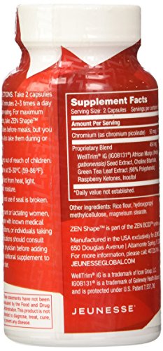 -. Binding : Health and Beauty -. Brand : Jeunesse -. EAN : 0089304800226 -. Feature : Promotes metabolic wellness / Supports healthy cholesterol levels / Promotes fat loss / Supports healthy blood sugar levels / Helps decrease carbohydrate and sugar cravings -. IsAdultProduct : 0 -. Label : Jeunesse -. LegalDisclaimer : These statements have not been evaluated by the Food and Drug Administration. This product is not intended to diagnose, treat, cure, or prevent any disease. -. Manufacturer : Jeunesse -. PackageQuantity : 1 -. ProductGroup : Health and Beauty -. ProductTypeName : HEALTH_PERSONAL_CARE -. Publisher : Jeunesse -. Studio : Jeunesse -. Title : ZEN Shape™ Was Made to Prepare the Body for Fat Loss. A Vital Part of the ZEN Bodi™ System. -. UPC : 089304800226