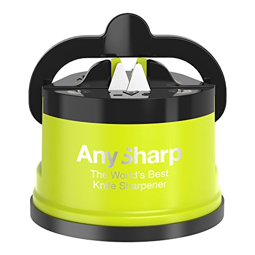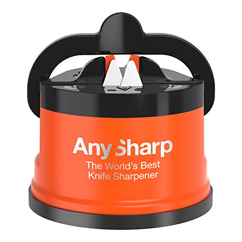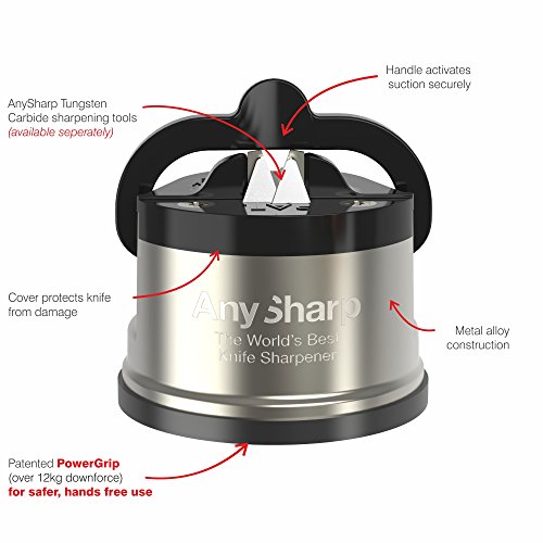 Save your old knives whether you're slicing meat, dicing vegetables, or carving the Sunday roast, a sharp blade makes cutting effortless. The any sharp pro knife sharpener restores a super sharp cutting edge to blunt knife blades that have dulled with use. Works with all your knives hardened steel the unique, patented any sharp uses tungsten carbide technology to extend the life of almost any knife. Any sharp works on virtually any knife, including expensive hardened steel knives. Serrated knives AnySharp even works with serrated blades* (like bread knives and hunting knives), making it unlike any knife sharpener, steel or sharpening stone you've ever used.(*Not very fine toothed serrated knives)no skill required the optimum angle to sharpen a good quality steel knife is 20 degrees. Any sharp is pre-set at 20 degrees to give a perfect edge every time. Getting a consistent angle with a sharpening stone is a skilled job, but any sharp allows anyone to get professional results without any training at all. AnySharp is safer by design hands free safety the any sharps unique safety feature is its power grip suction cup base, which attaches securely to any smooth surface or worktop without the need for any tools. Once its attached you can sharpen any knife safely hands free knife edge safety when your whole knife has been run through, your knife edge may touch as it exits the sharpening tools. The any sharp has a long-lasting polymer guiding top that is softer than metal, and therefore wont damage the metal edge, making it safe for your knives too. Less chance of accidents with a totally blunt knife, any sharp will hone it to a perfect angle, and remove excess metal rapidly the first time you use it. Once sharp, better results are gained by using only light pressure, and only microscopic amounts of metal are shed. Do remember to wipe the knife before use.Feature