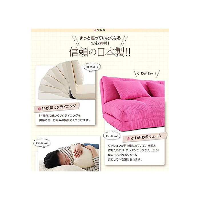 【소재】 (표지중재):(폴리에스텔,우레탄 팁(칩),우레탄폼,스틸 파이프) 【생산국】일본제 【부속】 쿠션2 개부착 【기능】 등 기대어 14단계 리클라이닝(수평 포함한다) ※당상품은,우레탄 팁(칩)를 사용 하고 있습니다. 우레탄 팁(칩)는 소프트에 체중을 받는 것 막는(멈추게 하는) 분,통상의 우레탄에 비해 서투르 #기 쉬운 특질이 있습니다.세세하게,형태를 조절해 사용해 하십시오. ※ 실제의 상품의 색에 최대한 접근할 수 있는 바와 같이(하도록),촬영을 행하고 있습니다만 상품색은,사용 모니터 로 인해 실제의 밝기나 색과,다소 다르게 보이는 경우 (이)가 있습니다. 또한제품의 사양 디자인은,예고 없이 변경하는 일이 있습니다. 미리 양해 바랍니다.상처가 들(날) 우려가 있기 때문에,카펫트 등에서상을 보호 해 사용 하십시오.