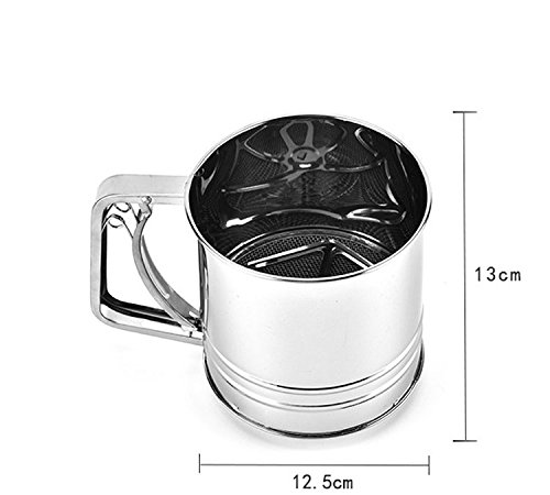 Features: - Sieve powder is designed to make flour fluffy. - Effectively remove clumps and debris from flour. - Mechanical mug style design, easy to use, sift more evenly. - Hold the handle, put the flour into the flour sieve, shake gently,flour will come out. - Can be controlled by one hand only. - Easy to clean,safe packing.