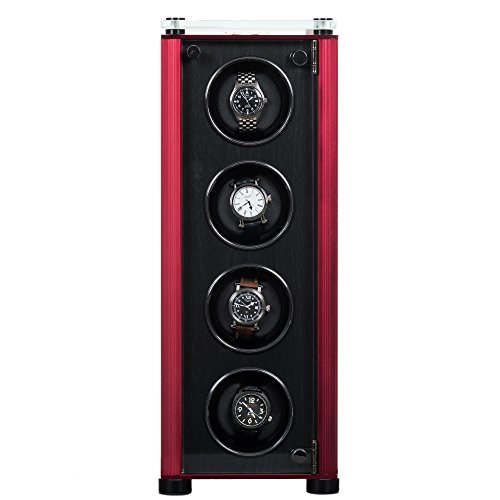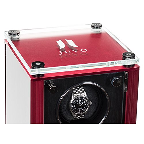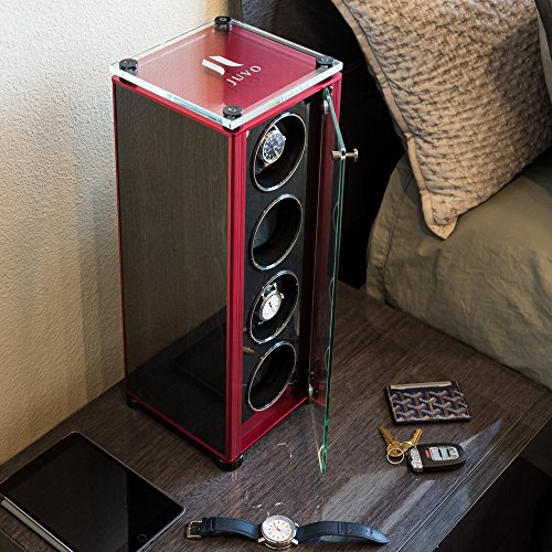 Studio : Time Atelier Publisher : Time Atelier Binding : Watch Product Description The JUVO M4 quad automatic watch winder features a contemporary modern design to hold three of your luxury watches, and keep them fully wound for accurate time. The JUVO M4 case is hand-made made with fine materials comprising of high gloss wood panel, glass cover, metal, and a fancy glass plate on top. Each winding unit has an oversized, high quality memory foam cushion with PU leather, and automated LED lights. There are four rotation options which are easy to operate with a turns per day (TPD) rate of 650 to 1500. It's also designed to rotate in three directional settings (Clockwise, Counter-Clockwise, Bi-Directional), which enables it operate majority the watch brands such as Rolex, Omega, Tag Heuer, Seiko, Brietling, Patek Philippe, Hublot, Audemars Piguet, Victorinox, IWC, Bulova, Hamilton, etc. The watch cushion can fit bigger and heavier watches (up to 55 mm). ITEM NUMBER: TA89717 COLOR: BLACK PANEL/RED TRIM DIMENSIONS: 7.87" L x 7.87" W x 20" H POWER ADAPTER: 110/240V AC power adapter ACCESSORIES: Microfiber cloth, white gloves, and instruction manual 0