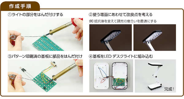 ●コンパクトに折りたためていつでもどこでも使える!!新指導要領対応教材ライトを自分仕様に改良できるセット!電源供給は乾電池とUSBの2タイプ単3電池3本使用(別売)/USB(ケーブル付属)学習内容:電子部品の働き(CdS、スイッチ、LED、トランジスタ、コンデンサ)エネルギーの変換(電気→光)はんだ付けの方法