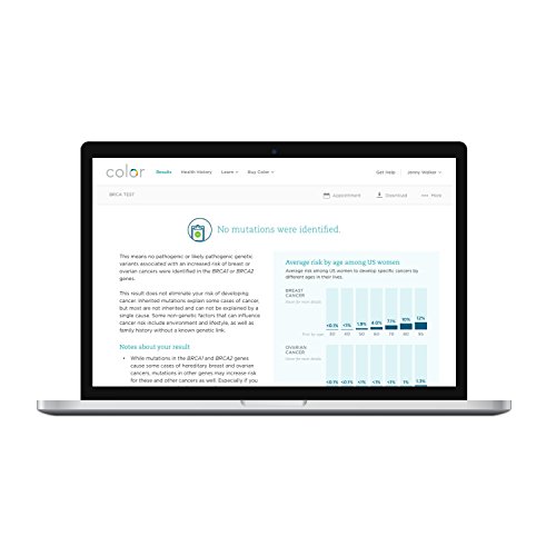 Studio : Color Genomics Publisher : Color Genomics Binding : Health and Beauty Product Description Color's easy saliva test looks for mutations in the BRCA1 and BRCA2 genes, the most common causes of hereditary breast and ovarian cancer. This is the first step in understanding your genetic risk for breast and ovarian cancer. Using this information, you can work with your healthcare providers to develop a personalized screening plan. Purchase Color's BRCA Test and we will ship it right to your home. Once received, go to www.color.com/activate to activate your test. Provide your saliva sample from the comfort of your home. Mail it back to Color in the same box it came in using the prepaid postage. You will receive your confidential results online after they are reviewed by a certified medical professional. We also make it easy to share and discuss your results with your doctor so that together you can create a screening and prevention plan designed for you. In addition, you will be able to make an appointment with one of Color's genetic counselors at no extra cost. Note: A portion of this fee will be applied towards administrative costs collected for an independent physician to review your information and determine whether testing is appropriate. If the test is not ordered, total cost will be refunded. At this time state regulations don't allow us to ship the Color Test collection kit to NY State addresses through Amazon. However, you can email us directly at support@color.com for alternative ways to purchase the Color Test. 0