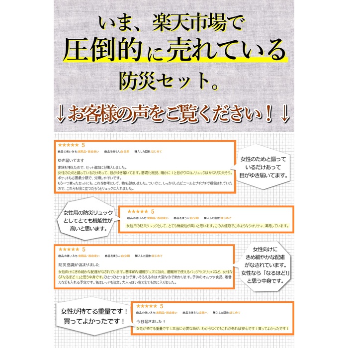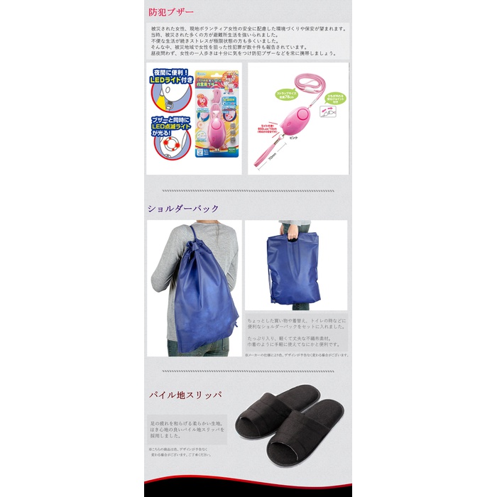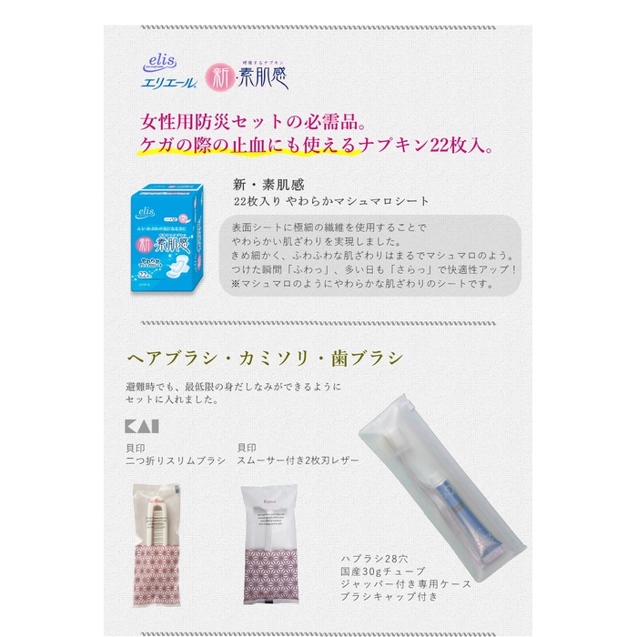 최신의 방재 상품피난 생활 용품과 여성 용품이 들어간 여성용 방재 세트.