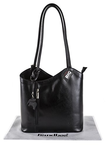 -. Brand : Big Handbag Shop -. Color : Black - Plain -. Department : Womens -. EAN : 5055536582327 -. Feature : A unique top zip opening shoulder handbag with twin strap which can be arranged to convert bag into a backpack / Supplied with our own Big Handbag Shop Branded Dust Bag and a Cute Elephant Charm / Vertical zip pockets at front and back of the bag and silver tone metalware / H x W x D: 28 x 28 x 8 cm (11 x 11 x 3 inch). Weight: 525 grams (1.15 lb, 18.51 oz), Shoulder Strap Drop: 30 cm (12 inch) / Fully fabric lining inside with centre zip pocket dividing the bag in two parts with a zip pocket on back wall of the bag and two open pouch type pocket on the front wall of the bag -. ProductGroup : Shoes -. ProductTypeName : HANDBAG -. Size : One -. Title : Womens Leather Hand Made Shoulder or BackPack Handbag - Made in Italy with a Branded Protective Storage Bag and Charm (F220_Black_Plain)