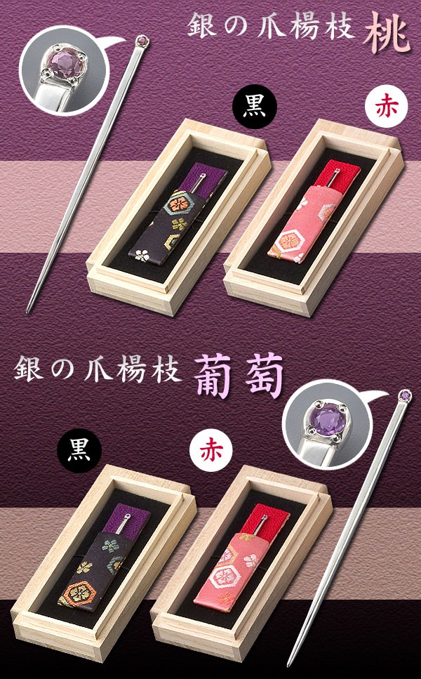 快適甲斐「銀の爪楊枝」は銀(SL925)を使って、シンプルな爪楊枝を製作し、古くから織物の産地として有名な富士吉田市の織物でできたケースで爪楊枝をジュエリー感覚で携帯する『My爪楊枝』です。銀の爪楊枝の桃にはピンクトルマリン、葡萄にはアメジストをイメージして宝石を配し、よりゴージャスで美しく仕上げました。銀の爪楊枝は使い捨てではなく、半永久的に使用できるため資源の無駄使いにならないエコなアイテムです。