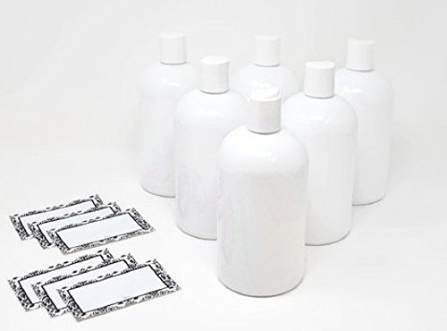 WHITE PLASTIC REFILLABLE BAIRE BOTTLES, 16 OZ White HAND-PRESS FLIP DISC CAPS, ORGANIZE Soap, Shampoo, Lotion with a Clean Look, 6 Pack, BONUS 6 DAMASK WATERPROOF LABELS