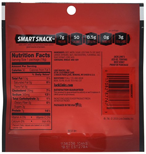 ReleaseDate : 2015-09-25 Studio : Jack Links Publisher : Jack Links Binding : Grocery Product Description With distinct sweet and spicy flavor and 7 grams of protein for only 50 calories, Jack Link’s Teriyaki Beef Jerky on-the-go lunch snacks are perfect for school lunches or after school snacks. This smart snack keeps you full while being low in fat, sugar, and carbs. The Teriyaki flavor is bold and savory, made with premium cuts of lean beef and seasoned with soy, ginger and a little onion. Varieties and flavors of beef jerky include Original, Peppered, Sweet Hot, Steakhouse Recipe, KC Masterpiece Barbeque, Jalapeno Carne Seca, Sriracha, Original Hickory Smokehouse, and Cholula Hot Sauce. Jack Link's also has Chicken, Turkey, and Pork Jerky varieties. Jack Link’s Original Flavor features a simple ingredient label that has no added MSG, no preservatives and no sodium nitrates. 0