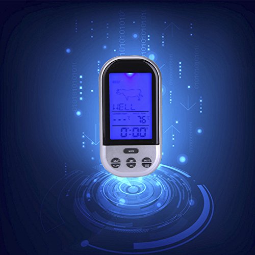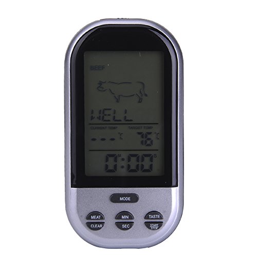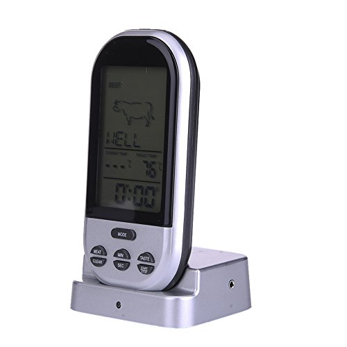 1. Name: Wireless barbecue thermometer 2. Model: SN023 3. Type: Electronic hygrothermograph 4. Accuracy class: 1.0 5. Resolution: 0.1 6. Scope: Kitchen, outdoor barbecue 7. Material: Environmental friendly plastic Food grade stainless steel 8. Temperature measurement range: 0-250 (℃) 9. Operating voltage: 1.5V, 4 * AAA batteries (not included) 10. Display: LCD 11. Error: ± 1 ℃ 12. Effective distance: ≤ 30 meters 13. Other functions: 1) 8 kinds of meat models 2) Backlight 3) Countdown / Timer alarm 4) ° C / ° F Unit switching 14. Weight: 120g 15. Size: 1) Display: 12 * 6 * 3 cm / 4.72 * 2.36 * 1.18 in 2) Probe: 18 5 cm / 7.09 1.97 in 3) Cord length: 100 cm / 39.37 in 4) Base: 7.2 * 5.5 * 2.5 cm / 2.83 * 2.17 * 0.98 in