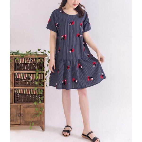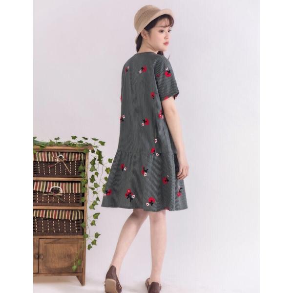 小花柄がワンポイントになった淡いストライプ柄のワンピースです。