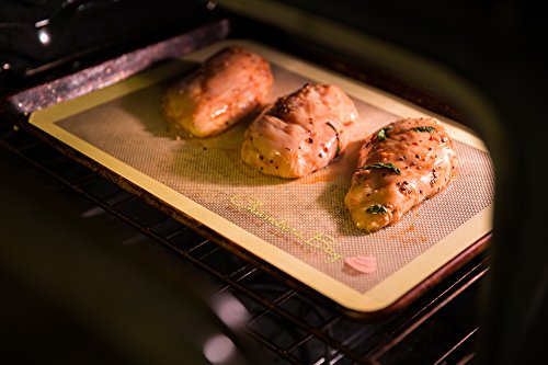 - PREMIUM VALUE: Includes TWO reusable 16.5 x 11.6 inch (half sheet) silicone baking mats in, quite possibly, the most attractive style yet to hit the market. These .75 mm thick mats deliver on what you need and give you what you want by combining designer style with exceptional quality.