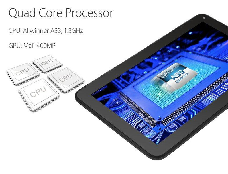 Allwinner A33 Cortex A7 Quad-core, 1.5GHz+ ARM Mali 400MP2 GPU |