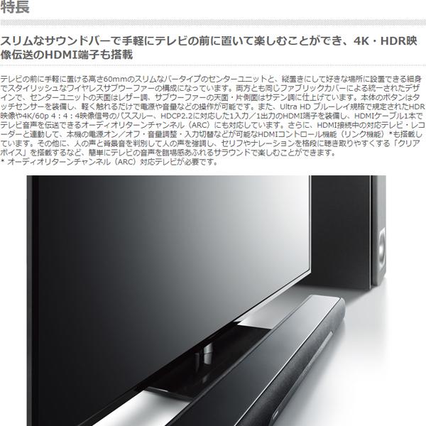 ●スリムなサウンドバーで手軽にテレビの前に置いて楽しむことができ、4K・HDR映像伝送のHDMI端子も搭載