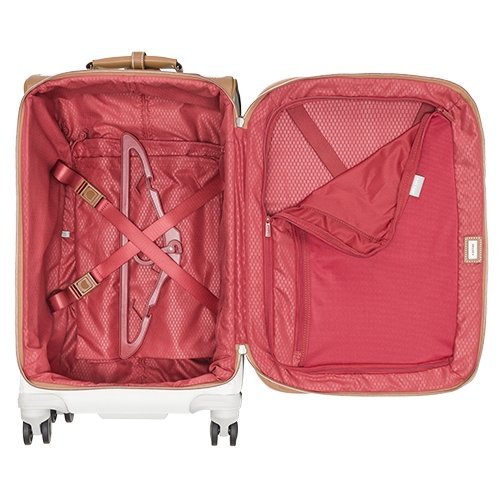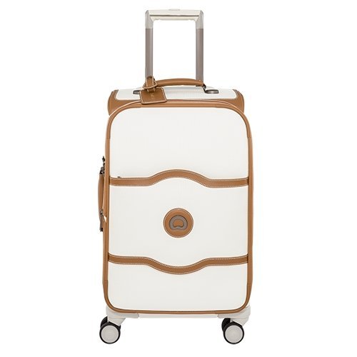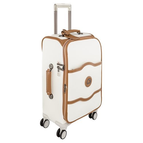 Studio : Delsey Luggage, Inc. Publisher : Delsey Luggage, Inc. Binding : Apparel Product Description The chalet soft collection from delsey Paris is the ultimate in sophisticated French design. Delsey has designed this collection as the soft side equivalent to the iconic chalet hard side collection. This 21 inch carry on spinner luggage is beautifully crafted with faux leather trim and durable 380d polyester with protective coating treatment for extra protection against debris and moisture for long lasting use. This case features top, side and bottom carry handles for ease of use when lifting into overhead bins or car trunks. Four silent double spinner wheels and dual locking telescoping handle assure zero weight on your arm during travel. A unique brake system, also found on the chalet hard side collection, is activated with a button and locks the front two wheels of the luggage, preventing the bag from drifting away while allowing travelers to roll the bag on the back two wheels. The exterior of this bag also features an integrated id plate, integrated tsa-accepted lock that allows only tsa agents to open and inspect the bag without damaging the lock, and a large front zippered compartment. The interior is elegantly appointed with two interior bags for shoes or laundry, travel hanger, tie down straps and zippered compartment for personal items. Fits in the overhead compartment of most domestic airlines. Worldwide limited 10 year warranty. 0