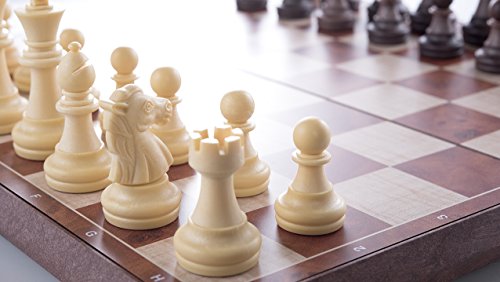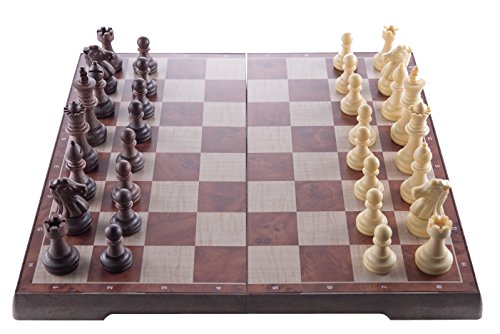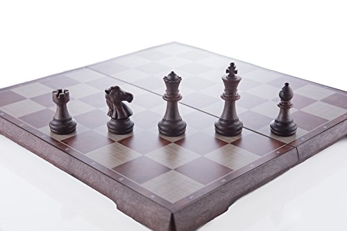 -. Feature : HIGH-QUALITY CHESS BOARD - A wood grain texture made of durable plastic provides a smooth feel while playing chess and checkers. It allows the chess set to be lightweight and portable. Premium, deluxe chess pieces provide a luxury feel. We guarantee that you will like our chess board for efficient and easy way to play chess and checkers. / MAGNETIC CHESS PIECES - Every piece is individually magnetized, making the game stable for playing on the go or playing outside. We know that magnetic chess pieces are very versatile and improve the game of chess. THE CHECKERS ARE NOT MAGNETIC. / FOLDING CHESS BOARD - The ergonomically designed folding chess board allows for simple storage of the chess pieces while being able to bring the board with you while traveling. The folding makes the chess very versatile, while its texture and look makes the chess set classy at the same time. / 2-IN-1 CHESS AND CHECKERS - whether you want to have the intellectually stimulating chess experience, or the more laid-back checkers game, this chess board has you covered. Learn to play both chess and checkers games / PORTABLE SIZE: the chess board measures 12.5" x 6.3" x 1.8" (31.5 x 16 x 4.5 cm) when closed; 2.8" King Piece; 2.6" Queen Piece. The chess set is perfect size. Just big enough to enjoy a real game of chess, and small enough to be versatile and easy to bring along anywhere you plan to travel.