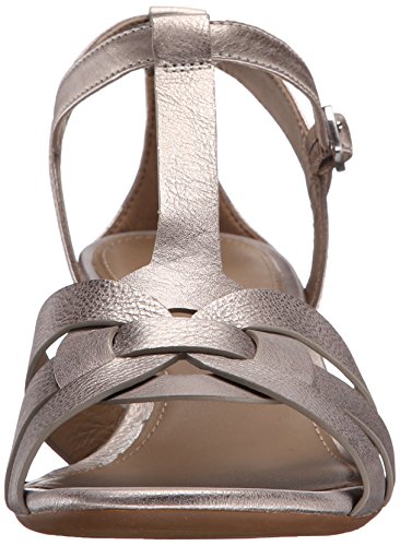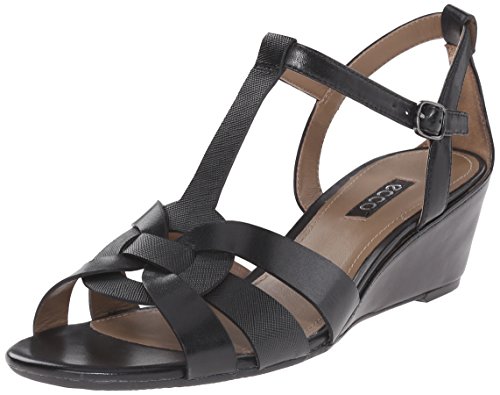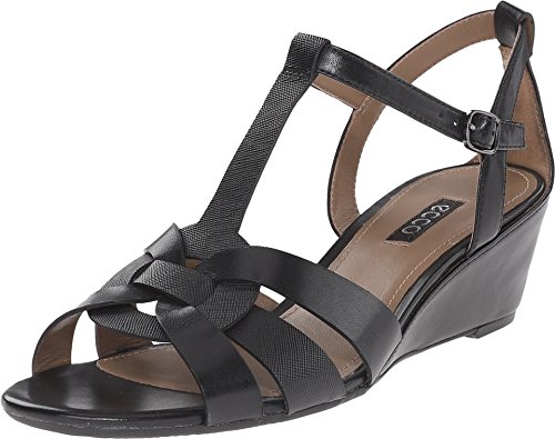 T-bar construction on a wedge sandal. Breathable eather lining. Synthetic sole for a comfortable feel. Rubber outsole.
