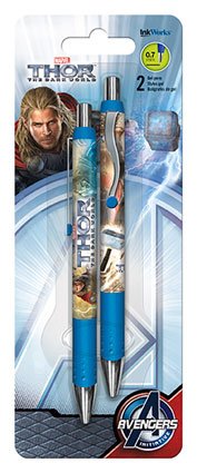 -. Feature : Set 2 pens have fun Thor the Dark World graphics. / Black Gel Pens are 0.7 mm. / Pens are retractable with clips and soft rubber grips. / Produced by InkWorks.