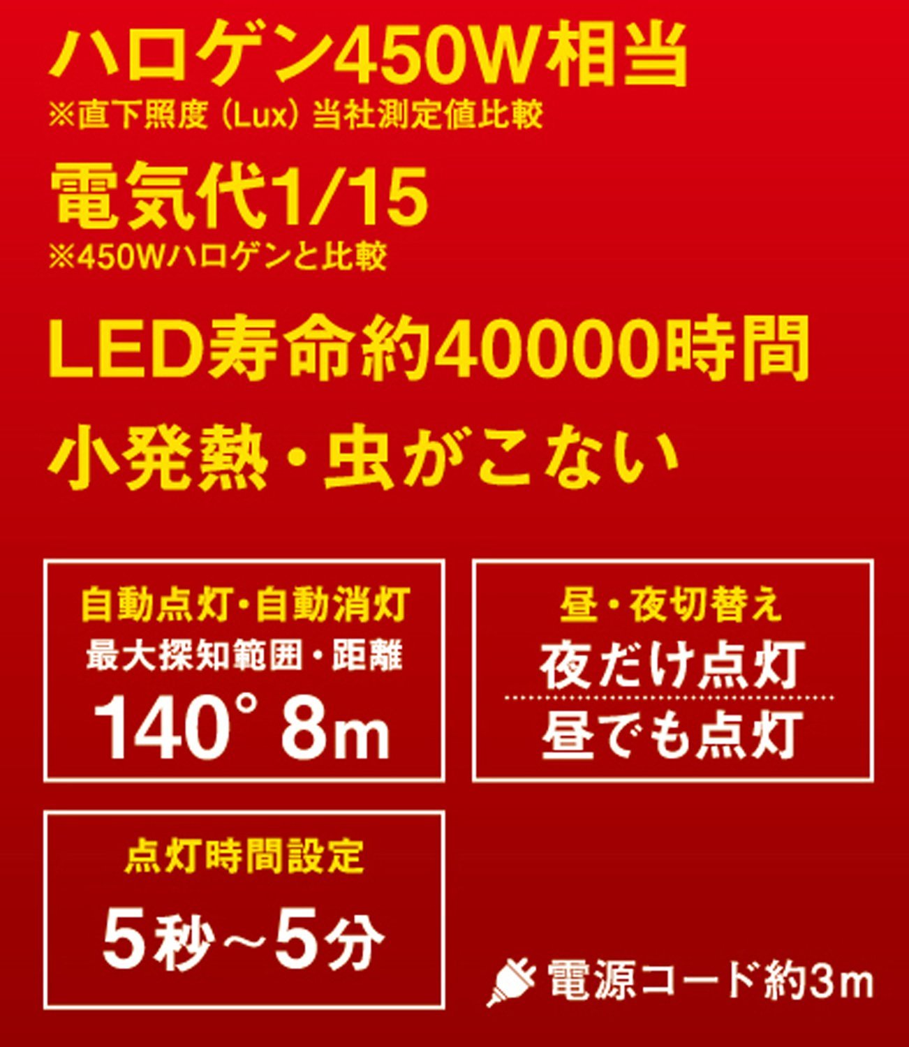 Brightness is about 2250 lumen (equivalent to halogen 450 W) * Direct illuminance (Lux) manufacturer comparison value comparison