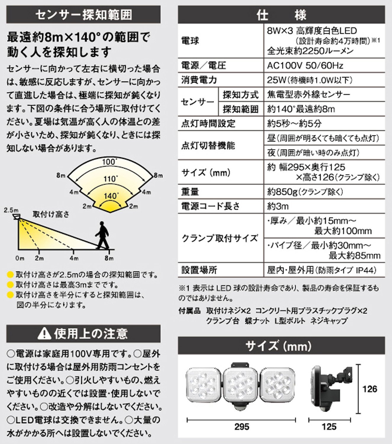 Purchased because the front of the entrance is dark. Because I wanted to light the door, entrance front pouch, concourse 3 directions, I bought this 3-lamp type. The door became bright, and the troubles I had struggled with finding a keyhole were solved. I ordered the pillar in front of the entrance (paint to the mortar) and asked the vendor to drill a hole and set up. The height is over 2 m. Four months have passed since the start of use, but I am very satisfied with no particular problems. The middle light moves only up and down. I can not do so much angle. You can freely angle the left and right lights up, down, left and right. It is better to think that flexibility works only for right and left lights. There is no point that the direction will change by the wind etc. by making the angle and fixing the screw fast. The brightness is about enough. There is also a 12 W × 3 light type on this, but I thought that it was probably too bright, I dared to 8 W × 3 light type. It is natural that you look dazzling if you look directly, but it is spreading rather than searchlights, and there is no discomfort. For the brightness I chose this product and I think that it was a correct answer. The color of the light is white, but it is not a bad white that feels cold. This item is recommended.