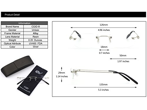 -. Brand : CGID -. Feature : Lightweight:Slim Arms and Rimless Design makes it super lightweight when you wearing it. / Safty:Rounded smooth plastic Nuts on both sides of the Bridge Ensure the Maximum Safety of your face,when you fall or collision. / Customization:Always custom made to your individual order specifications. / Premium:Better style better quality and always less than retail. / Including:1X Eyeglasses, 1X Leather Hard Case,1X Cleaning Tissues. -. IsAdultProduct : 0 -. Label : Happy Adult -. Manufacturer : Happy Adult -. Model : 2016XTLH -. MPN : 2016XTLH -. PackageQuantity : 1 -. PartNumber : 2016XTLH -. ProductGroup : Health and Beauty -. ProductTypeName : PERSONAL_CARE_APPLIANCE -. Publisher : Happy Adult -. Studio : Happy Adult -. Title : Happy Store Light Unisex Men and Women Stylish Sleek Design Oval Rimless Frameless Magnifying Resin Lenses Spring Hinge Reading Glasses Readers