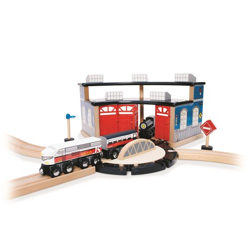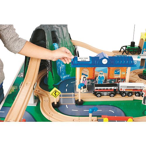- Feature : The Imaginarium Mountain Rock Train Table delivers hours of fun train play with over 100 pieces that include 23' of track, lights and sounds, a play table with storage drawer, eight trains, two vehicles, three traffic signs, a fueling station, five cargo bundles, four streetlights, five wooden figures, four rock trestles, two viaducts, four trees, a crossing gate, two trestles, two construction zone cones, four rocks and over 55 pieces of wooden track and accessories to create the track layout shown (instructions included). The assembled table size is 47.75"L x 32.5"W x 15.75"H, providing lots of play space for all your big and little conductors. Compatible with Thomas & Friends and Brio wooden train sets (each sold separately). •Over 55 pieces of wooden track and accessories create up to 23' of track for a variety of setup options