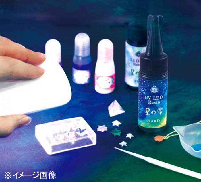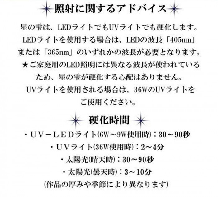 | 星の雫は、LEDライトでもUVライトでも硬化する進化版1液性レジンです。これまでのUVレジンに見られた経年劣化による黄変はなく、いつまでもきれいな透明感を維持します。また、とても早く硬化するので作業がスピーディになります。 |
