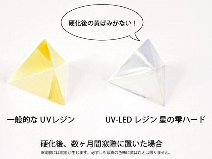 星の雫は、LEDライトでもUVライトでも硬化する進化版1液性レジンです。これまでのUVレジンに見られた経年劣化による黄変はなく、いつまでもきれいな透明感を維持します。また、とても早く硬化するので作業がスピーディになります。 |