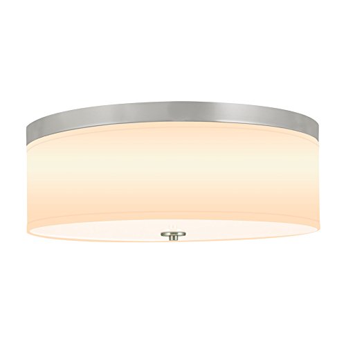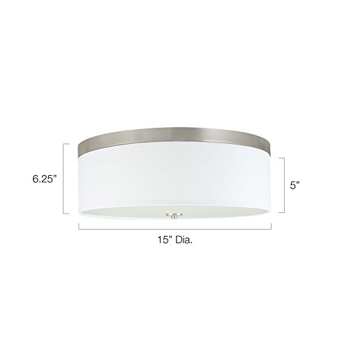 This modern flush mount ceiling light features a 15" unique white lamp shade with a brushed nickel finish. Ceiling fixture accomodates (3) 40W incandescent bulbs. This ceiling fixture includes as Frosted White tempered glass diffuser that helps exude a smooth and clean look .The ceiling light would look great in any kitchen or living room. Some assembly required. While you may see many similar products from our competitors, we ensure that our products are UL listed. Ensuring that you can enjoy our products with a comfort of mind, knowing we put your safety first. This modern flush mount ceiling light also comes in two different shade colors, finishes, and sizes.