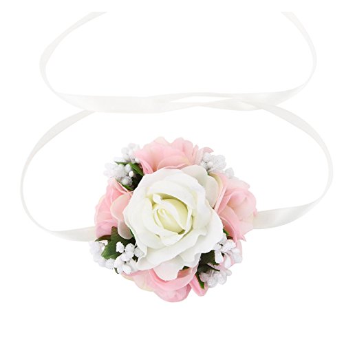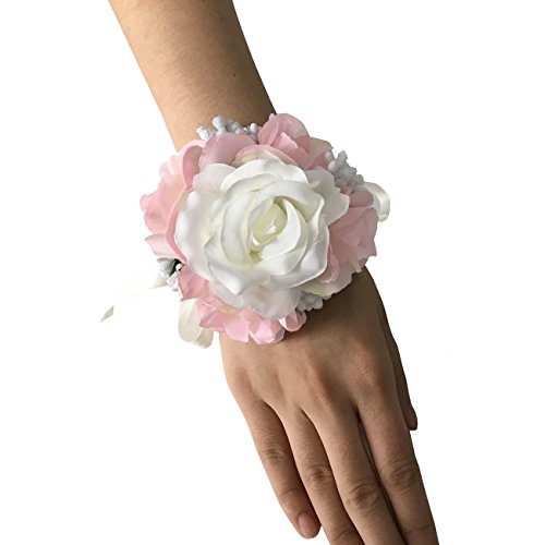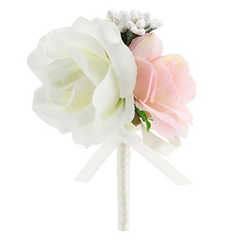 FAYBOX Wedding Prom Ivory Pink Silk Flower Wrist Corsage and Boutonniere Set Pin Ribbon Included