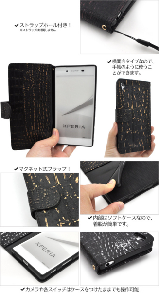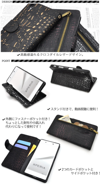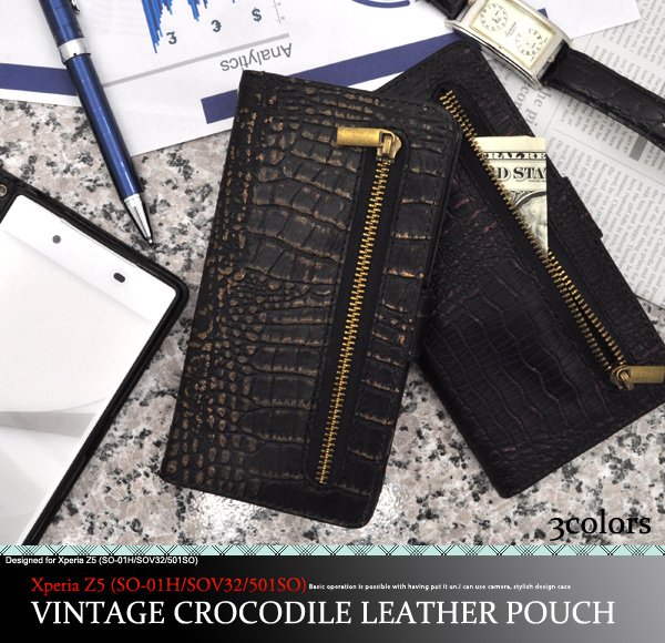 クロコダイルレザーデザインのXperia Z5 (SO-01H/SOV32/501SO)用スタンドケースポーチ。