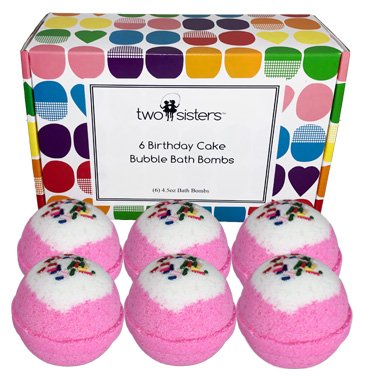 Our Birthday Cake Bath Bomb makes the best birthday gift for the bath lover in your life. When dropped in the water, this bath bomb will fizz and bubble, releasing it's skin-nourishing oils, birthday cake fragrance, and pink color into your bath water. This bath bomb weighs 4-5oz and is about the size of a tennis ball. Ingredients: sodium bicarbonate, citric acid, epsom salts, sodium lauryl sulfoacetate, fragrance oil, olive oil, water-based colorant, witch hazel, and colored sugar sprinkles.Feature