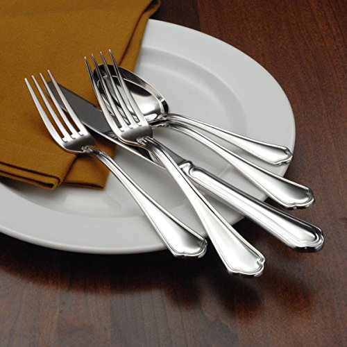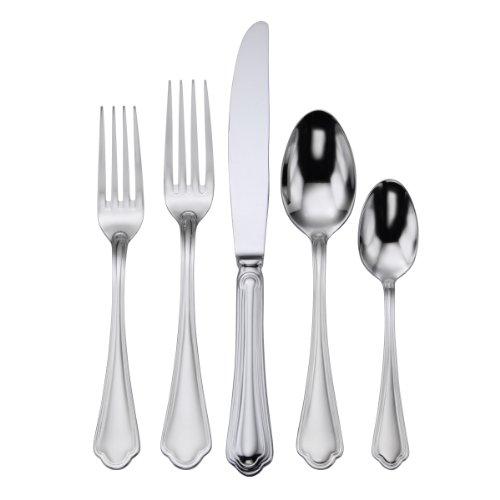 5-piece flatware set with service for 1. Set includes 1 each: salad/dessert fork, place fork, place knife, place spoon, and teaspoon