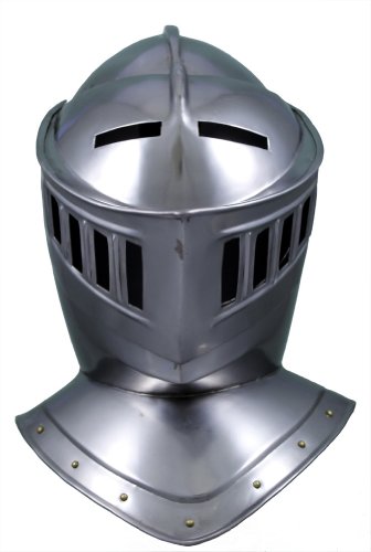 This 18 gauge steel closed helmet is an excellent example of those worn by knights in 15th century Europe. The closed style helmet helps protect the face and cheek area better than other helmet styles of the time. This helmet is handcrafted and adorned with small brass accents along the neckline. The helmet is full sized and wearable as a costume piece. It also makes a wonderful decor item. 0 |