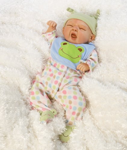 -. Binding : Baby Product -. Brand : Paradise Galleries -. EAN : 0010475421224 -. Feature : Amazingly lifelike and realistic 20 inch baby doll sculpted by artist Michelle Fagan / Sleepy Frog was sculpted so realistically in baby soft GentleTouch vinyl to look and feel just like your own real baby / His weighted soft cloth body (with beads and pellets) and adorable sleepy face will make you think you're holding a real baby / He'll serenade you with "Rock-a-Bye Baby" when you press the musical chip in his bib / Sleepy Frog has beautiful hand painted details, hand applied eyelashes and hand painted hair to achieve a true newborn look -. IsAdultProduct : 0 -. Label : Paradise Galleries -. Manufacturer : Paradise Galleries -. MPN : 21002200fbauk -. PackageQuantity : 1 -. PartNumber : 21002200fbauk -. ProductGroup : Toy -. ProductTypeName : TOYS_AND_GAMES -. Publisher : Paradise Galleries -. Studio : Paradise Galleries -. Title : Paradise Galleries Realistic Baby Dolls, Sleepy Frog, 19 inch With Weighted Body (Artist: Michel... -. UPC : 010475421224