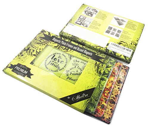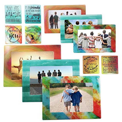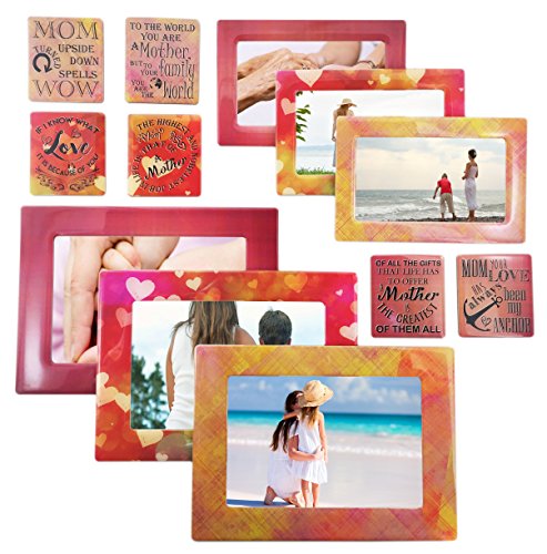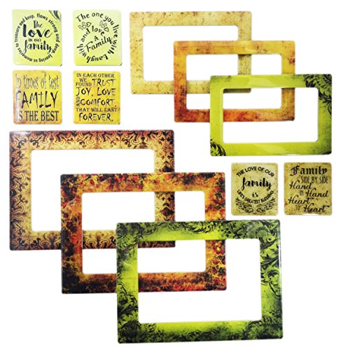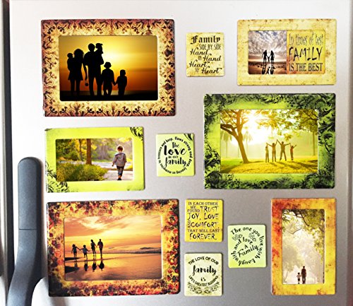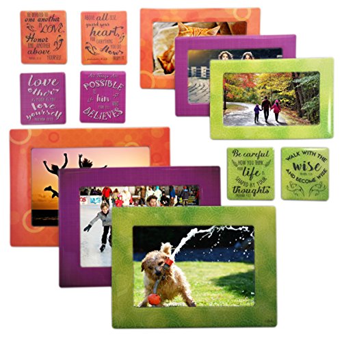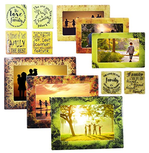 12 PIECE SET: This set includes three(3) magnetic frames that hold photo sizes 5x7 and 4x6, three(3) magnetic frames that hold picture sizes 3.5x5, 3x5, 2.5x3 and wallet and six(6) strong magnets with inspirational and appreciating quotes for family. Display lists notes reminders messages photos calendar etc. Decorate any magnetic surface.