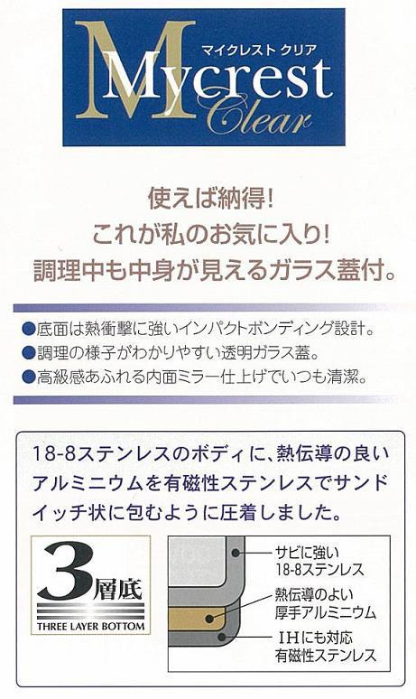 | 素材・材質 | 本体:ステンレス鋼(18-8)底厚0.6mm、貼り底:アルミニウム・18-0ステンレス鋼、フタ:強化ガラス、樹脂部:フェノール樹脂 |