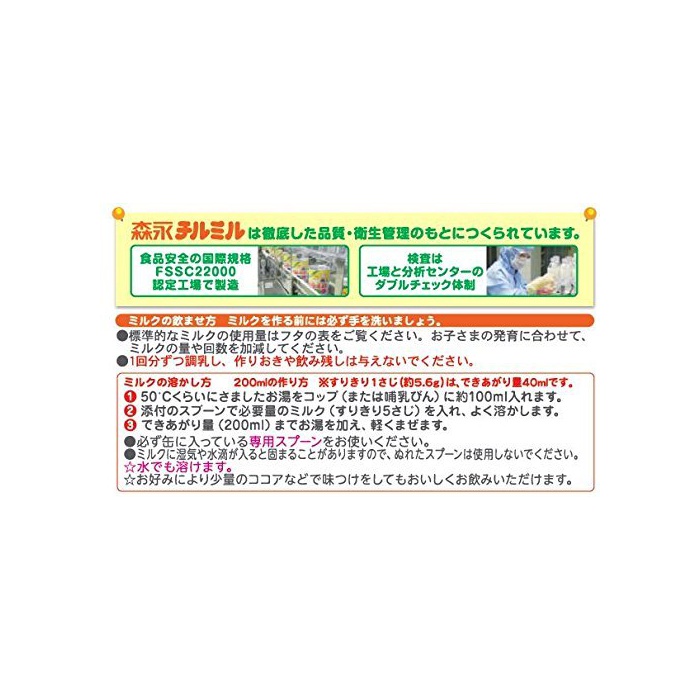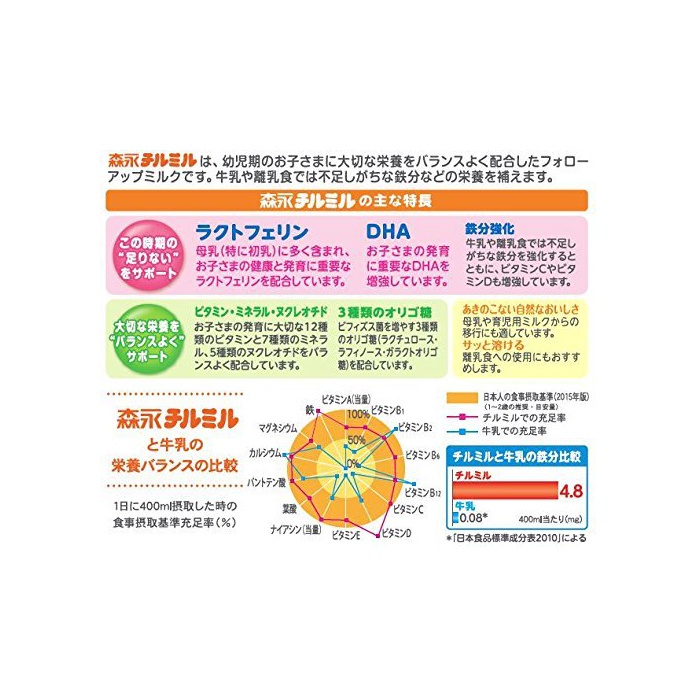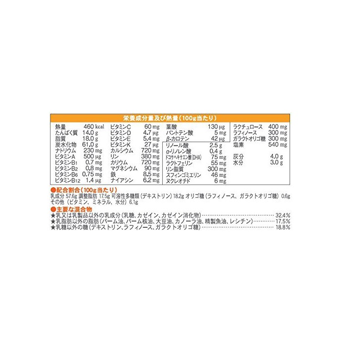 원재료:유당,덱스트린,조정 지방(팜유,팜핵유,대두유,카 노《라》유)고, 《호에이파우다》(유청단백질)고, (Kasein)카세인,탈지분유,단백질 농축《호에이파우다》,버터 밀크 파우더,유당 분해액(락《추로스》)고, 갈락토올리고당액당,정제어유,러프《노스》,(Kasein)카세인 소화물,탄산 칼슘,염화 마그네슘,인산3칼슘,인산3칼륨,고, 레시틴,구연산3나트륨,염화 칼슘,탄산 칼륨,인산 수소2칼륨,비타민C,락토페린,염화 칼륨,《피로린》산 제2철,구연산,비타민E,니코틴산 AMI 드,판토텐산 칼슘,비타민D3,시틸딜산 나트륨,inosinic산 나트륨,비타민A,《구아니루》산 나트륨,비타민B6,5''-《아데니루》산,비타민B1,비타민B2,엽산,β-카로텐,비타민B12