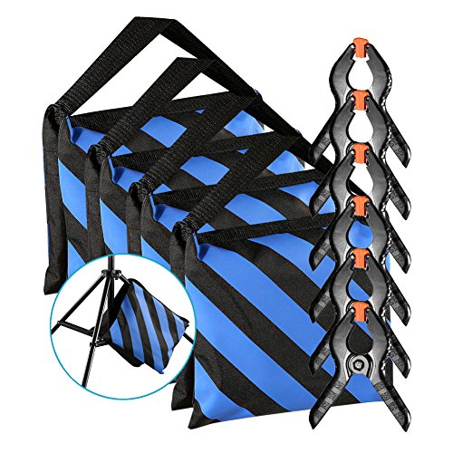 NOTE: The Light Stand, Background and support system are not included Description: Sandbags are useful in the studio to help stabilize your lighting equipment. Also useful with boom arms, light stands, tripod, etc. This bag comes empty and can be filled with gravel, sand, rocks, or any other material to add weight. Heavy duty handle of the sandbag makes using these sandbags simple. These spring clamps are perfect to hang your backgrounds onto your support system or clamp lights to stands. Spring clamps helps to grips the background to the backdrop stand. Strong clamps to fit onto most standard sized stands. Specifications: Sandbag: Material: PVC Color: Blue/Black Spring Clamp: Quantity: 6 Maximum Opening: 2 inches mouth Length: 4.3 inches/11 centimeters Package Contents: 4 x Sandbag 6 x Spring Clamp 0