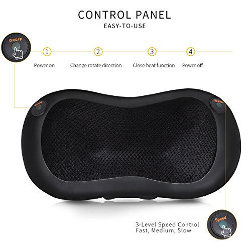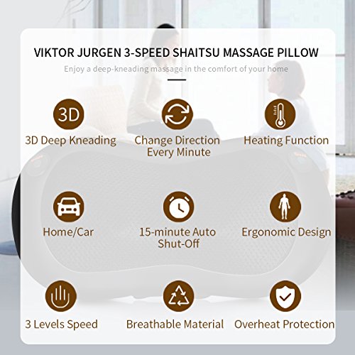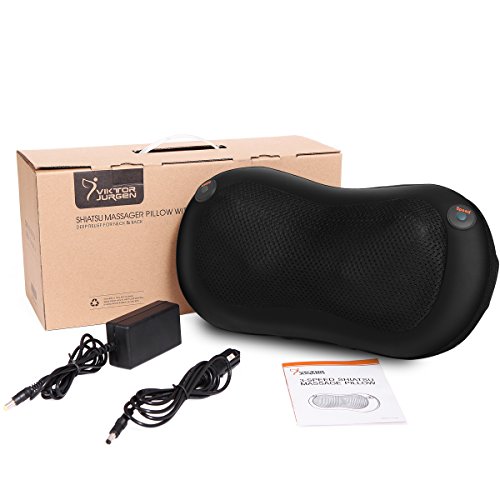 VIKTOR JURGEN Shiatsu Kneading Neck and Shoulder Massager Pillow Don't let neck shoulder pain haunt you all the time. With more attention than ever on improving well-being, massage has become a popular treatment. VIKTOR JURGEN 3-Speed Neck Massager Pillow with ergonomic design,deep issue massage and Heat for your body perfectly to present you a cozy massage which is perfect for use on the neck, lower back, upper back, abdomen, calf, thigh areas and so on, which helps to relieve aches, knots, tension and stress,gives you an unforgettable massage experience!Your move personal masseus.
