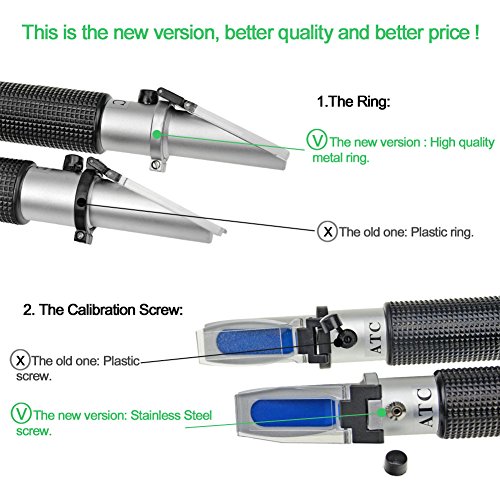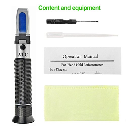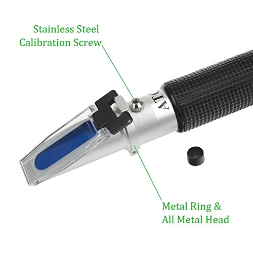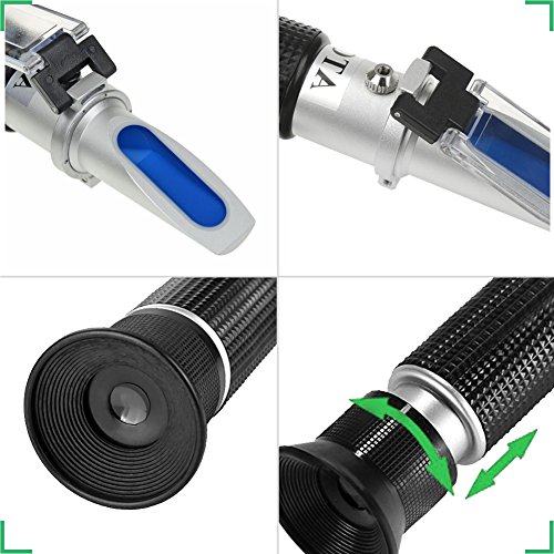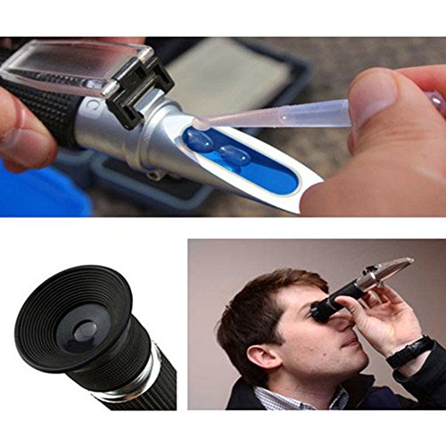 Measurement The liquid measurement is very easy. Place a few drops of the liquid on the optical part of the refractometer, cover the prism (the liquid will spread more easily over the prism), look throught the eyepiece against the light (focus, if necessary) and you will be able to read the result value on the scale.