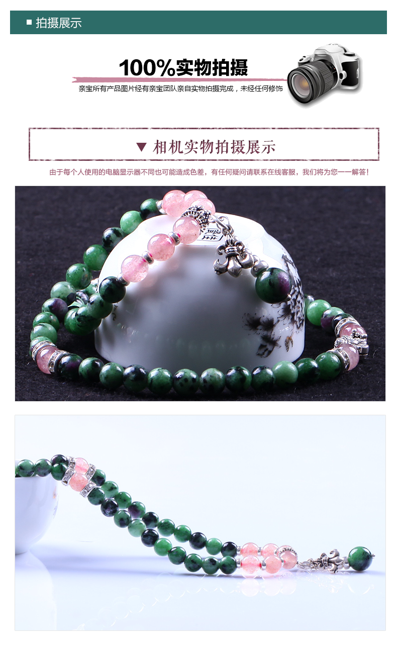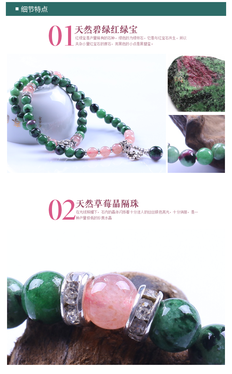 她不仅仅是一条手链:都说女人是水做的,她还是女人最神秘的小伙伴。因为这个是精致的冰糯种红绿宝,是经过上亿万年远古河床冲刷而成的含有水属性的宝石, 她水润,她浓艳,她更能让女人变得更水。此款属于女人的专属定制,女人只有真正拥有自己的一条红绿宝那才是一个完整的女人