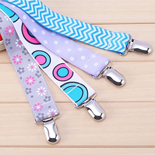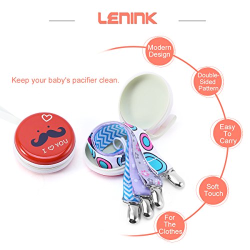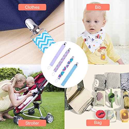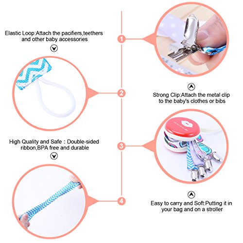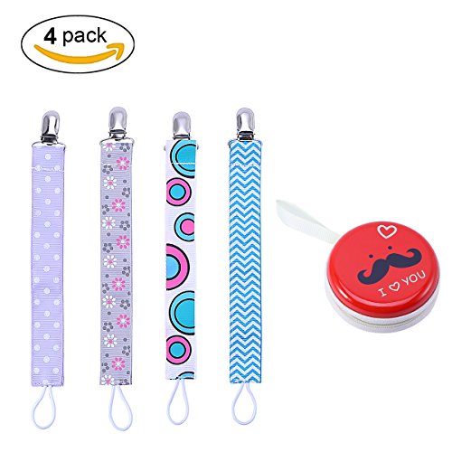 -. Feature : Multifunction: Modern design pacifier clip for baby boys and girls,easy to attach to the baby's clothes and bibs.Using it to hold pacifiers,teethers,soothers,baby toys and other baby accessories to prevent falling and dirty,good gift to the baby. / Easy to Use: Attach the metal clip to the baby's clothes or bibs,attaching the pacifiers,teethers and other baby accessories to the elastic loop at the end. / Easy to carry and Soft:The baby pacifier clip has very soft touch,easy to clean and carry,putting it in your bag and on a stroller. / High Quality and Safe: Universal pacifier holder made of high-quality metal clip and double-sided ribbon, BPA free and durable.Do not worry about falling pacifiers,and reduce the frequent cleaning troubles. / Packing Included: 4pcs Baby Pacifier Clip + 1pcs Pacifier Case.Do not hesitate,add to the shopping cart now,offering baby's mother a practical gift.
