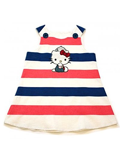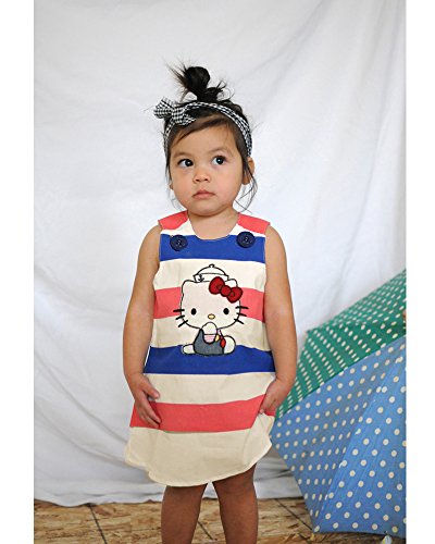 Simply adorable jumper A-Line dress has Hello Kitty wearing a sailor hat appliqued on front. Bold wide striped background of natural earth tones of red, white, and blue. Blue anchor buttons at shoulders. 100% cotton. Made in the USA!Feature