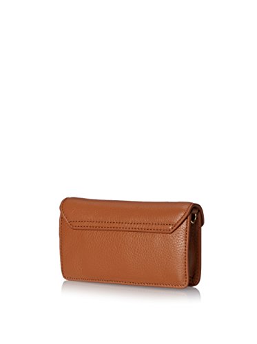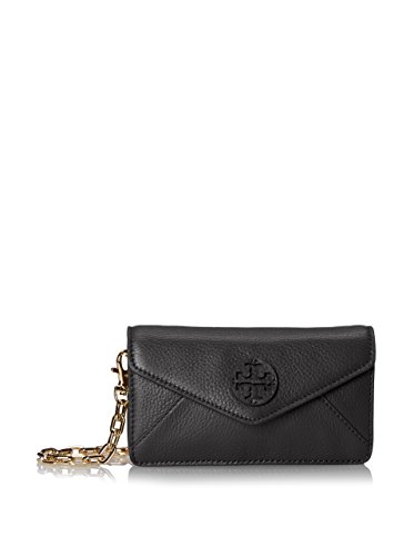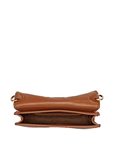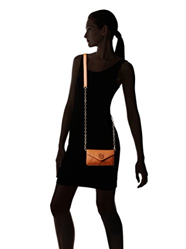 This compact and elegant Stacked T Envelope Cross-body and clutch is wrapped in luggage brown pebbled leather with golden tone hardware. The interior is lined in coordinating fabric and features 2 card slots. The flap top secures with a magnetic closure and is accented with a Tory's Stacked T logo. The removable golden chain strap features swiveling lobster claw clasps and has a drop of about 23 inches. It is quite versatile and can be worn as a shoulder bag, a cross-body, or easily remove the strap and carry it as a clutch. This small gem measures approximately 6.5 inches (L) x 3.75 inches (H) x 1.5 inch (W).Feature