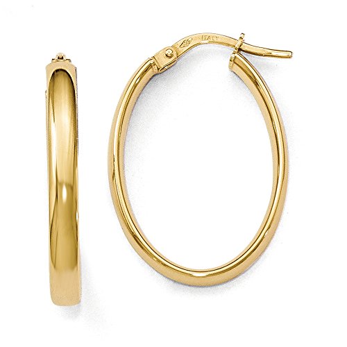 Simplicity offers versatility and timeless appeal in a 14k yellow gold design featuring a hollow oval shaped tubing that is approximately 3mm (1/8 inch) in thickness, 18mm (11/16 inch) in width and 26mm (1 inch) in length. Made in ItalyFeature