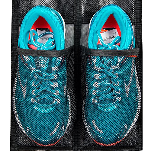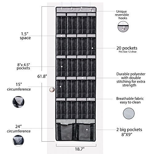 -. Feature : Unjumbly's unique 2 DOUBLE sized mesh pockets along the bottom row, makes this hanging shoe organizer one of the most versatile storage solutions around! The other 20 LARGE mesh pockets are each big enough to hold a mens size 12 shoe or a pair of flats or kids shoes. You will be able to easily see what is stored in the pockets through the high quality mesh, freeing up floor space and helping you kick clutter today! / Unlike any other over the door shoe organizers out there, Unjumbly includes REVERSIBLE durable metal hooks (be wary of shoe organizers that come with plastic hooks or only include 3 hooks - both of which are much less robust). These over-the-door hooks fit over the two most popular sized doors in homes, thinner closet doors as well as thicker internal doors meaning your over door storage WILL fit snugly and securely (or your money back!) / Unjumbly's over the door shoes organizer is a GREAT PRACTICAL GIFT IDEA for anyone who isn't organized or anyone who loves to BE organized, as well as for all those in need of additional storage (apartment storage, RV storage, office storage - the possibilities are endless!). Unjumbly uses only premium quality, breathable fabric and each pocket is double stitched for extra strength meaning this over the door organizer is built to last! / From a closet shoe organizer to an over the door pantry organizer, craft storage, bathroom storage or cleaning supply storage - transform your jumbled wardrobes and cupboards today! / We'll only provide you with the finest over the door shoe storage and service around, or your money back! Add the Unjumbly DELUXE door hanging organizer to your cart, and you will receive our ONE YEAR money back guarantee as well as experience the Unjumbly customer experience phenomenon!