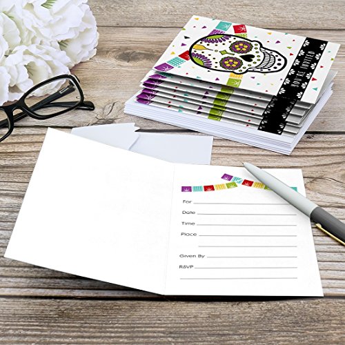 Day Of The Dead Fill-In the Blank Invitation Set INCLUDES 8 sugar skull party invitations and premium white envelopes. The colorful theme is great for a wedding, Halloween or birthday party.