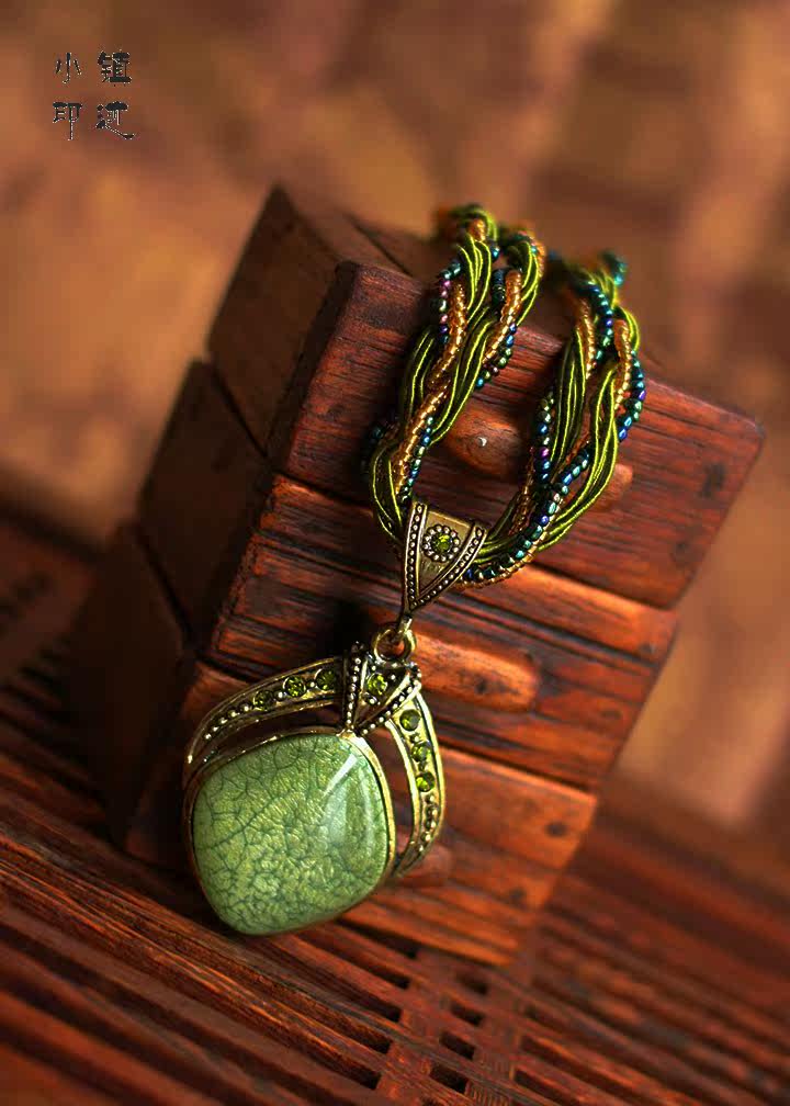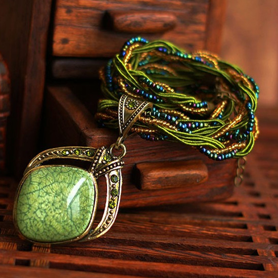 Material: synthetic amber, copper alloy, colored silk, beads, rhinestones