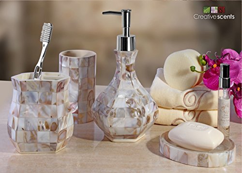 - Title : Creative Scents Milano Bath Ensemble, 4 Piece Bathroom Accessories Set, Mother of Pearl Milano Collection Bath Set Features Soap Dispenser, Toothbrush Holder, Tumbler, Soap Dish - Natural Mosaic Capiz