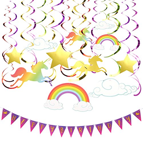 -. Title : 30-Count Swirl Decorations and Birthday Banner - Unicorn Decor Party Decorations, Ceiling Streamers, Hanging Whirls for Kids, Multicolored, Hanging Length: 36.5 Inches